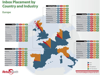 EU5(イギリス、ドイツ、フランス、スペイン、イタリア)内業種別(非営利組織、消費者製品、消費者サービス、金融サービス、ゲーム、メディア、小売、ソーシャルメディア)にEメールの受信箱に占める割合を示している。
